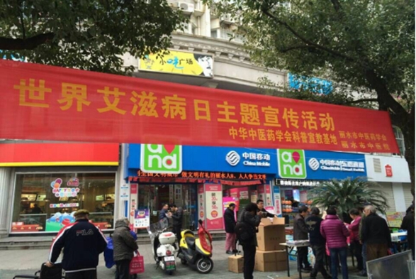 2015年12月1日我会科普宣教基地——丽水市中医院借助“十二五”课题平台,联合丽水市中医药学会与丽水市疾控中心在丽水市举办了预防艾滋病宣传咨询服务活动,共同完成课题公益活动。十余名工作人员通过现场咨询、摆放展板、发放宣传资料等形式向群众宣传艾滋病的危害、传播途径、预防艾滋病及国家对艾滋病防治政策等知识。现场累计发放艾滋病防治知识宣传折页800余份、安全套1000余个、环保袋500多个、艾滋病宣传纸巾480份等多种宣传品。通过宣传活动号召全社会积极投身于艾滋病防治工作,关爱艾滋病病毒感染者、病人及其家庭,消除歧视,共同承担防治责任和义务,群策群力,各展所长,遏制艾滋病的流行。