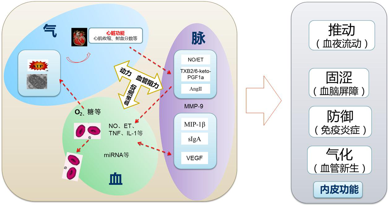 传统气血理论认为“气为血之帅”,“血为气之母”;“元气即虚,必不能达于血管,血管无气,必停留而瘀”,说明了气、脉、血三者关系密切,但“脉”在“气虚血瘀”中的作用尚不明确。项目组通过临床观察和实验研究,发现与脉相关的血管功能异常是“气虚血瘀”的关键环节,能量代谢异常贯穿了“气虚血瘀”的全过程。了脉(血管)在“气虚血瘀”形成过程中的重要作用,提出了“气虚于脉而血瘀,血阻于脉则 气虚,气血交互于脉,三者互为因果”的“气、脉、血相关”学说。
