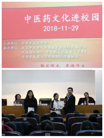 活动当天,孙永章副秘书长代表中华中医药学会向陈经纶中学嘉铭分校师生代表赠送了《中医药文化》科普书籍。孙永章表示,中医药文化进校园活动,是贯彻落实习近平总书记关于发展中医药重要指示的具体行动,是培养中医药后备人才和宣传中医药文化的积极的探索。同时,他提出了三点希望:一是希望这次活动能帮助青少年增进对传统文化核心价值理念的认知和认同;二是希望通过学习和动手参与,让青少年切身感受中医药文化的博大精深。三是希望通过中华中医药学会、北京中医药大学、参与活动的中小学三方的共同努力,发现中医药的好苗子,探讨培育中医药后备人才的新机制,为中医药发展提供源源不断的人才储备,为健康中国作出新贡献。
