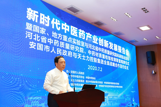 中华中医药学会副会长兼秘书长王国辰通过连线的方式出席了报告会并致辞。他表示,在全国疫情防控阻击战取得重大战略成果,全国中医药行业深入贯彻落实《中华人民共和国中医药法》宣传月活动启动之始,特别是近期习近平总书记充分肯定中医药在抗疫斗争中发挥重要作用,极大地增强了我们中医药人文化自信之际,召开此次报告会具有重大意义。安国市政府联合天士力控股集团共同打造安国数字中药都这一中药材公共服务平台示范项目,体现了河北省、保定市和安国市各级政府加大招商引资、壮大企业力量、做大祁药品牌的坚定决心;组建河北省中药质量研究院并联合四家国家和地方重点实验室推动联合科研创新,体现了以“政产学研”机制创新引领行业技术升级的前瞻视野;主办新时期中医药产业创新发展高峰报告会,汇聚行业最前沿的学术领袖共同为中药材事业发展献计出力,体现了一方政府在着眼地方经济发展的同时,敢为行业先的的胸怀和担当。安国市委、市政府把聚焦数字化新技术的广泛应用作为实现中药材产业高质量发展的引擎,准确找到了新时代药材专业市场独特比较优势的最有力抓手。同时,政府、企业和科研院所有机联动、优势互补,为全国中医药产业积累了可复制、能推广的宝贵经验。