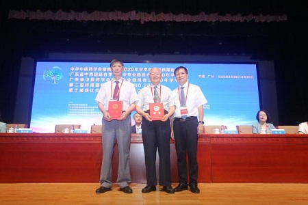 中华中医药学会陈达灿副会长为脑病分会终身名誉主任委员刘茂才教授、黄培新教授颁发证书