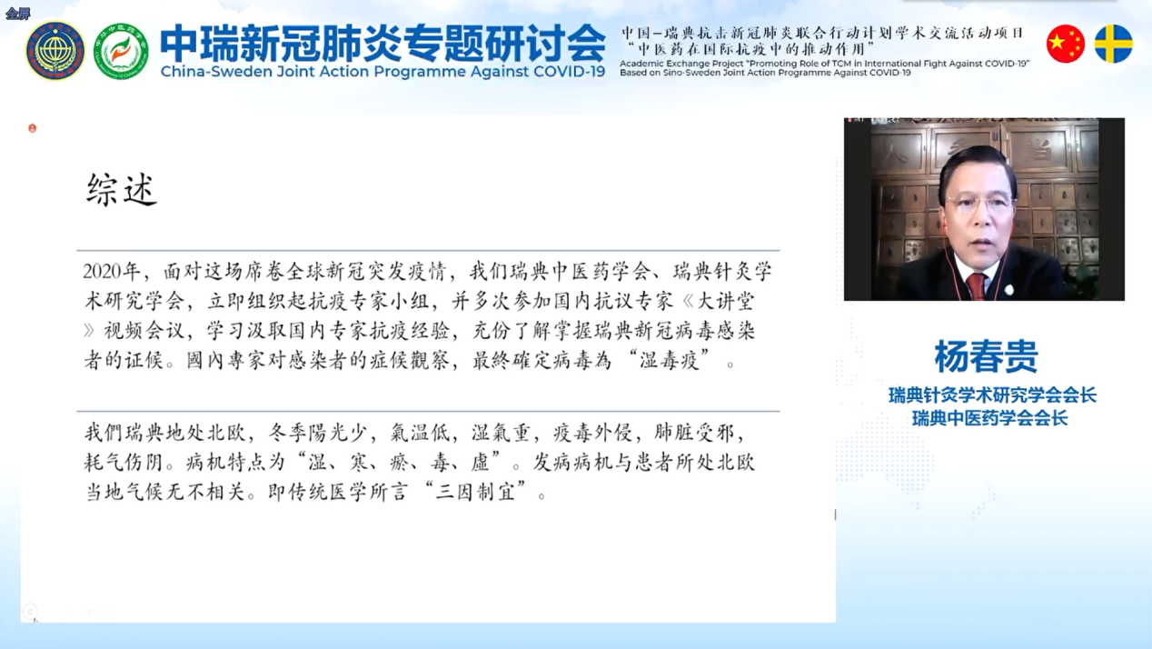 来自瑞典针灸学术研究学会的杨春贵会长与张冬青副会长分别作了题为《学习国内专家抗疫经验临床体会》、《针灸治疗新冠后遗症临床体会》的主旨演讲,与国内的专家学者分享了研究会积极学习中国抗疫智慧的成果,交流了以针灸方法治疗新冠肺炎后遗症状的经验。