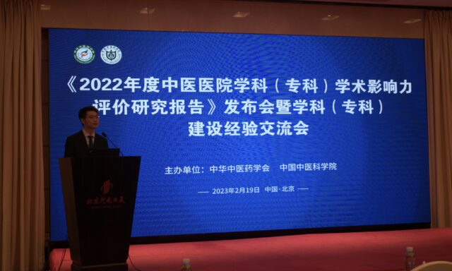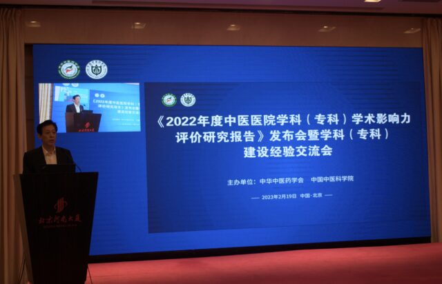2023年2月19日,中华中医药学会、中国中医科学院在北京共同召开《2022年度中医医院学科(专科)学术影响力评价研究报告》发布会暨学科(专科)建设经验交流会。国家中医药管理局医政司司长贾忠武,中华中医药学会副会长兼秘书长王国辰,中国中医科学院副院长唐旭东,人民日报健康客户端、人民日报社健康时报副总编辑王君平,中国中医科学院中医药信息研究所所长李海燕等出席会议,上榜单位代表中国中医科学院西苑医院党委书记张允岭、中国中医科学院广安门医院风湿科主任姜泉、广东省中医院大科主任陈前军、上海中医药大学附属曙光医院肝病科主任孙学华等受邀进行学科(专科)建设经验交流。部分在京中医药专家及相关媒体等出席会议。会议由中华中医药学会副秘书长陈俊峰主持,同步进行线上直播。