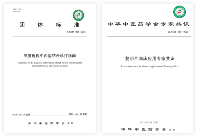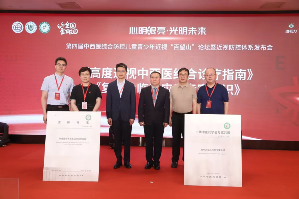 2023年6月3日,第四届中西医综合防控儿童青少年近视“百望山”论坛暨近视防控体系发布会在京举办,会上发布了中华中医药学会团体标准《高度近视中西医结合诊疗指南》(T/CACM 1489-2023)、《复明片临床应用专家共识》(GS/CACM 325-2023)。中华中医药学会副秘书长陈俊峰、标准化办公室负责人苏祥飞,中国中医科学院眼科医院副院长、全国中医药儿童青少近视防治中心主任亢泽峰,中国中医科学院中医药信息研究所所长李海燕等参加会议并参与指南共识揭牌仪式。