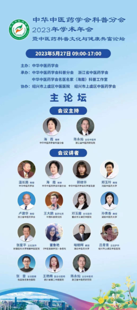 由中华中医药学会主办,中华中医药学会科普分会、浙江省中医药学会、中华中医药学会名医名家(海霞)科普工作室承办,绍兴市上虞区中医医院、绍兴市上虞区中医药学会协办的“中华中医药学会科普分会 2023 年学术年会”于5月27日-28日在浙江省绍兴市举行。