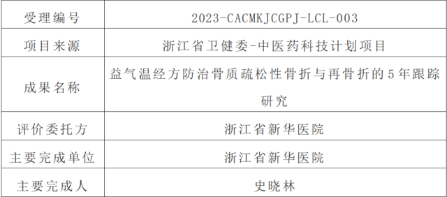 按照《中华中医药学会科技成果评价工作管理办法(试行)》相关内容,经形式审查,拟开展“益气温经方防治骨质疏松性骨折与再骨折的5年跟踪研究”成果评价工作,相关信息如下: