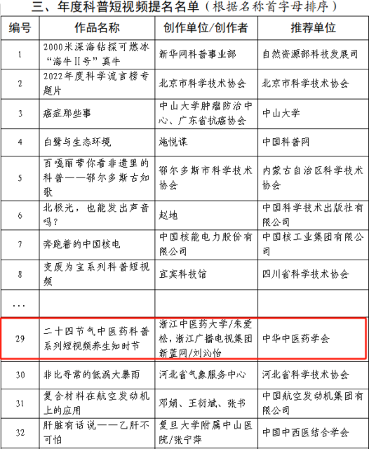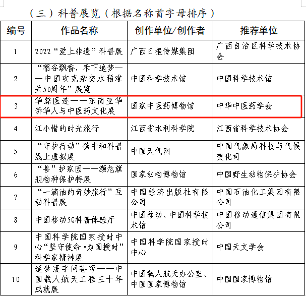 近日,中国科协公布了“典赞•2023科普中国”年度科普人物、年度科普作品、年度科普短视频提名名单,由我会推荐的“华踪医迹——东南亚华侨华人与中医药文化展”荣获年度科普作品——科普展览提名(全国共10项);推荐的二十四节气中医药科普系列短视频《养生知时节》荣获年度科普短视频提名(全国共100项)。