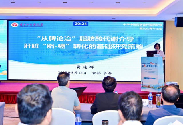专题报告环节,贾连群教授作《从脾论治脂肪酸介导肝脏脂-癌转化的基础研究策略》学术报告,系统阐述了从脾论治在肝脏脂质代谢与癌变转化中的机制与研究路径。立足中医理论,结合现代分子生物学技术,介绍了团队在脾虚证动物模型构建、脂质代谢组学分析以及相关信号通路调控方面的创新发现,为中医药干预肝癌前病变提供了新的思路和实验依据。